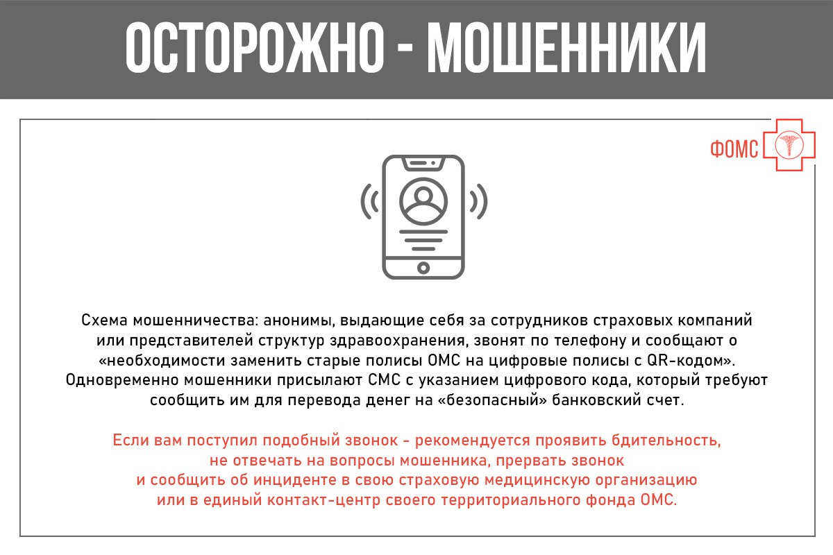 Гражданам начали поступать звонки с требованием заменить их полисы обязательного медицинского страхования на новые с QR-кодом. Мошенники представляются сотрудниками страховых медицинских организаций, Территориальных фондов ОМС, Федерального фонда ОМС и в ходе разговора пытаются убедить людей, что срок медицинского полиса истек, или можно оформить полис в виде пластиковой карты, документ необходимо срочно заменить в соответствии с новыми правилами. Одновременно злоумышленники могут прислать застрахованному СМС с указанием цифрового кода, который требуют сообщить им для перевода денег на «безопасный» банковский счет, просят установить мобильное приложение на телефон или перейти по присланной ссылке. Таким образом мошенники получают доступ ко всем приложениям в телефоне, в том числе и к банковским.