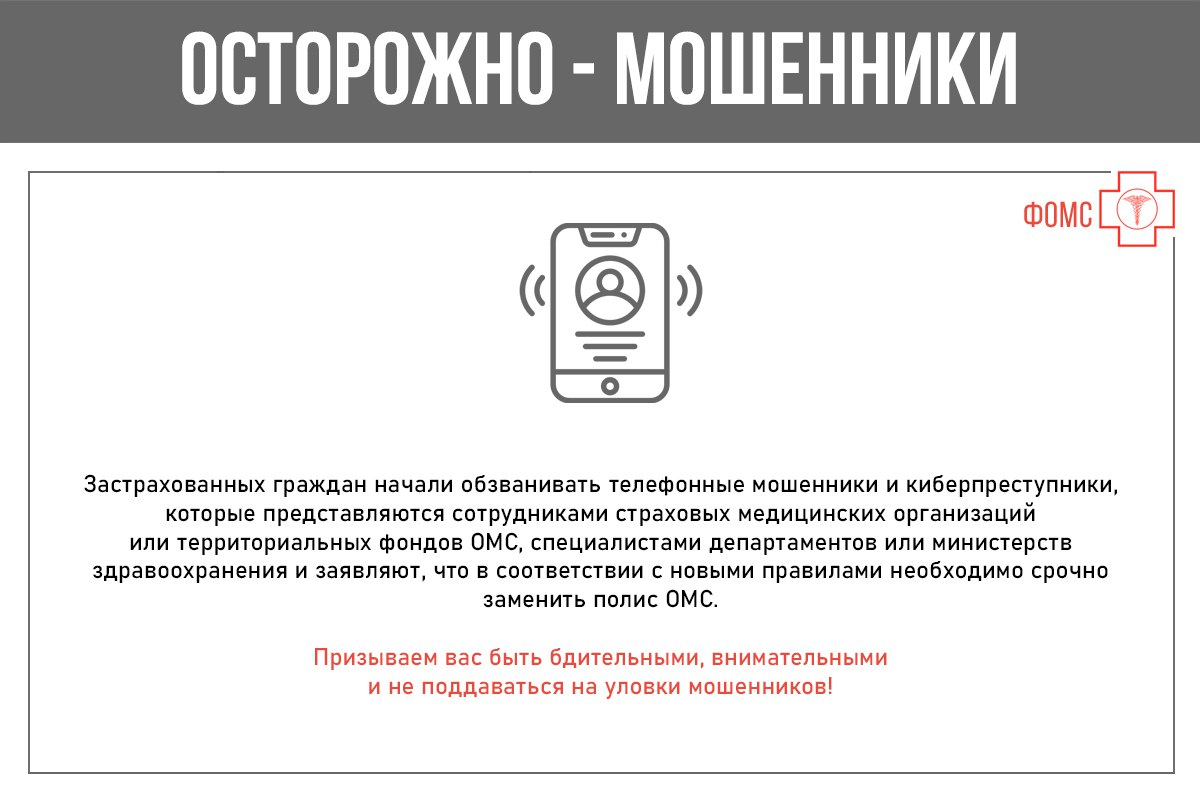 В настоящее время участились случаи мошеннических звонков гражданам Российской Федерации от имени представителей Федерального фонда, Территориальных фондов ОМС или страховых медицинских организаций с сообщением необходимости замены полисов ОМС.